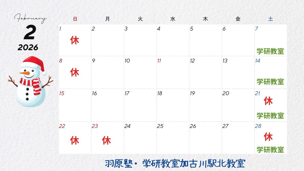 (羽原塾カレンダー)2026年1・2月の予定 2026 1/12 イベント お知らせ January 12, 2026 イベント お知らせ この記事が気に入ったら フォローしてね! Follow Me よかったらシェアしてね! URLをコピーしました! 日岡神社へ初詣・合格祈願に行ってきました ⛩ 鹿嶋神社 学神祭について 関連記事 羽原塾の定員につきまして April 15, 2026 🌸 2026年春休み教室(羽原塾の学研教室)のご案内 March 6, 2026 🌸「春季講習コース」の内容・料金(2026年4月12日まで) February 24, 2026 🌸 学研教室 春の無料体験学習(羽原塾) February 21, 2026 (羽原塾の日本版DBSへの対応方針)子どもの安全を最優先に考える取り組みについて January 9, 2026 公開検定・模試 実施日一覧(JR加古川駅徒歩9分 羽原塾) January 1, 2026 【漢検】のお申込み(JR加古川駅徒歩9分:羽原塾加古川校) January 1, 2026 「数検」のお申し込み(JR加古川駅徒歩9分:羽原塾加古川校) January 1, 2026